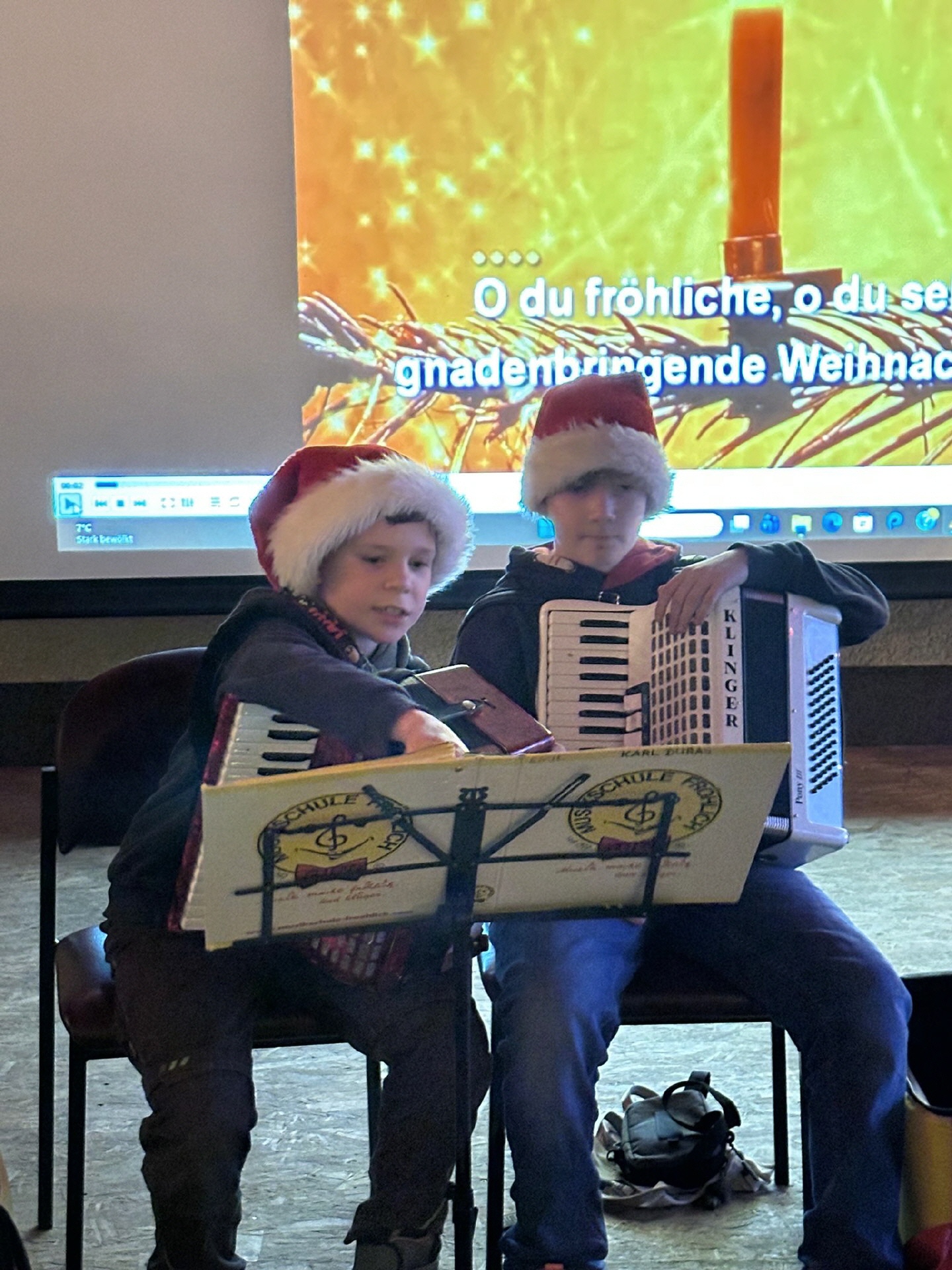 Begonnen wurde diesmal mit Karl Duras und Ronon Rosin. Die beiden Schüler der Musikschule Fröhlich spielten auf dem Akkordeon gemeinsam ein Weihnachtslied. Anschließend gab es zwei Blöcke mit je 6 Liedern zum Mitsingen.