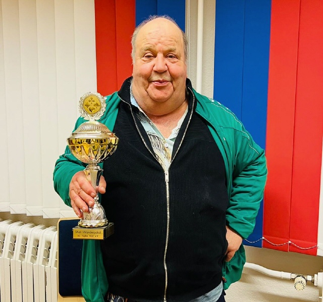 Am Ende des Abends hielt wieder einmal Rainer Witte den Pokal in den Händen. Den Wanderpokal hatte er schon beim vorletzten Turnier gewonnen, musste ihn dann kurzzeitig aus der Hand geben – vermutlich nur, damit er nicht einstaubt – und hat ihn sich nun souverän zurückgeholt.