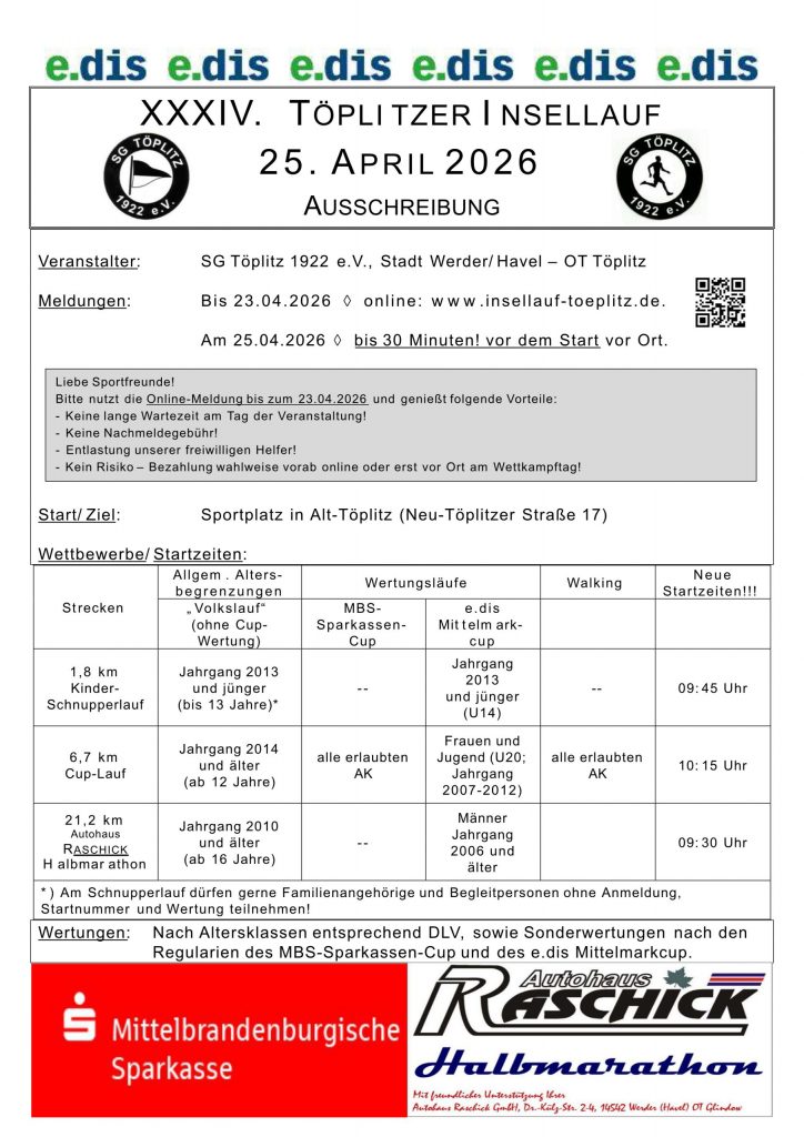 Willkommen beim jährlichen Töplitzer Insellauf, Sport, Spaß und Gemeinschaft auf der Insel Töplitz. Erfahre hier alles über den Halbmarathon, Sparkassencup und Familienlauf. Die Onlineanmeldung ist bis zum 23.04.2026 geöffnet.